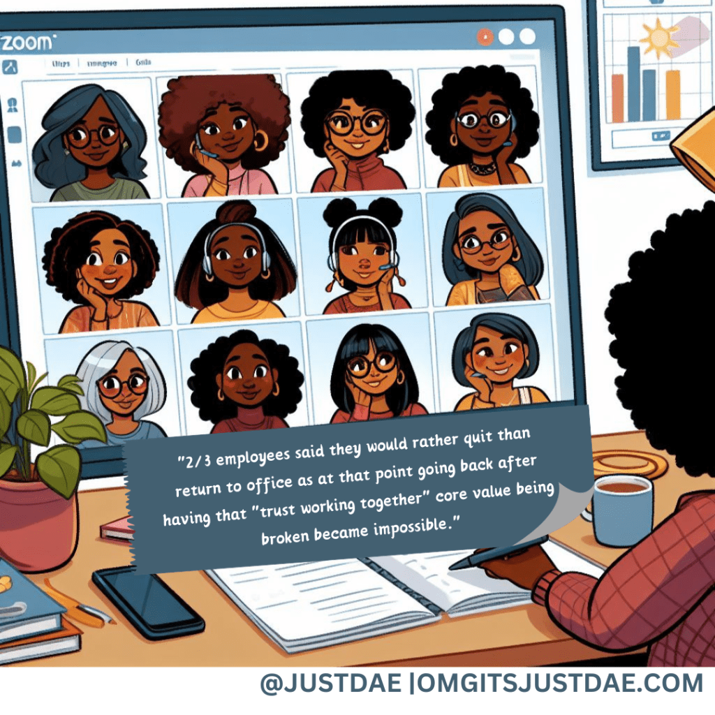 Two-thirds of employees said they would rather quit than return to office as at that point going back after having that “trust working together” core value being broken became impossible.