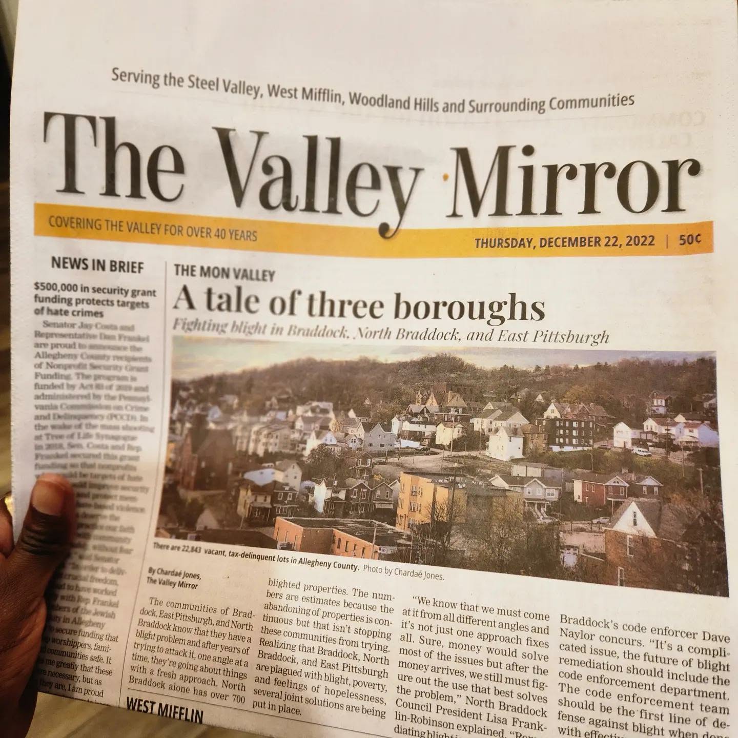 “Why don’t you go to crime scenes? The last mayor went to crime scenes?” My first crime scene was my last. I was sharing the car with my boyfriend, so I walked around the corner to the boat launch, where they had just identified a body. They had a social media photo of the victim, and I didn’t know the person. It turns out that they weren’t from Braddock. In a small town where everyone knows everyone, word spread fast.